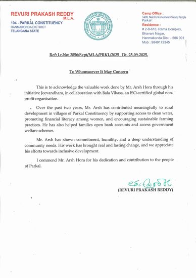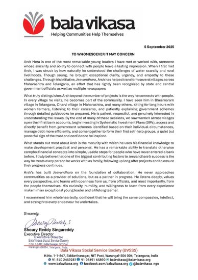 Acknowledged for my work in the State of Telangana by providing access to water, financial literacy workshops for women, supporting them in opening bank accounts and access government schemes.