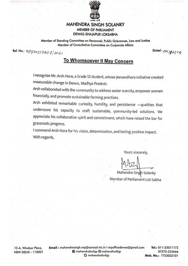 Commended for my work in Madhya Pradesh for addressing water security, financial literacy, and sustainable farming practices.